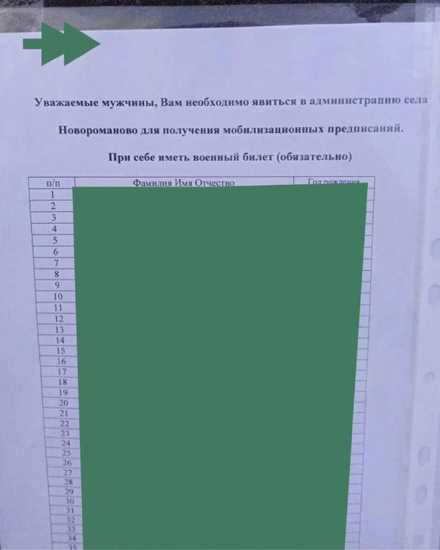 “Уважаемые мужчины, Вам необходимо явиться в администрацию села Новороманово для получения мобилизационных предписаний. При себе иметь военный билет (обязательно).”